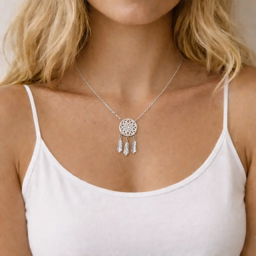 Este collar atrapa sueños combina simbolismo y elegancia en una joya ligera y femenina. El colgante circular, inspirado en el atrapasueños tradicional, incorpora delicados detalles colgantes que aportan movimiento y un acabado visual equilibrado. Es un diseño pensado para mujeres que buscan un collar con significado, fácil de llevar a diario y sencillo de combinar.