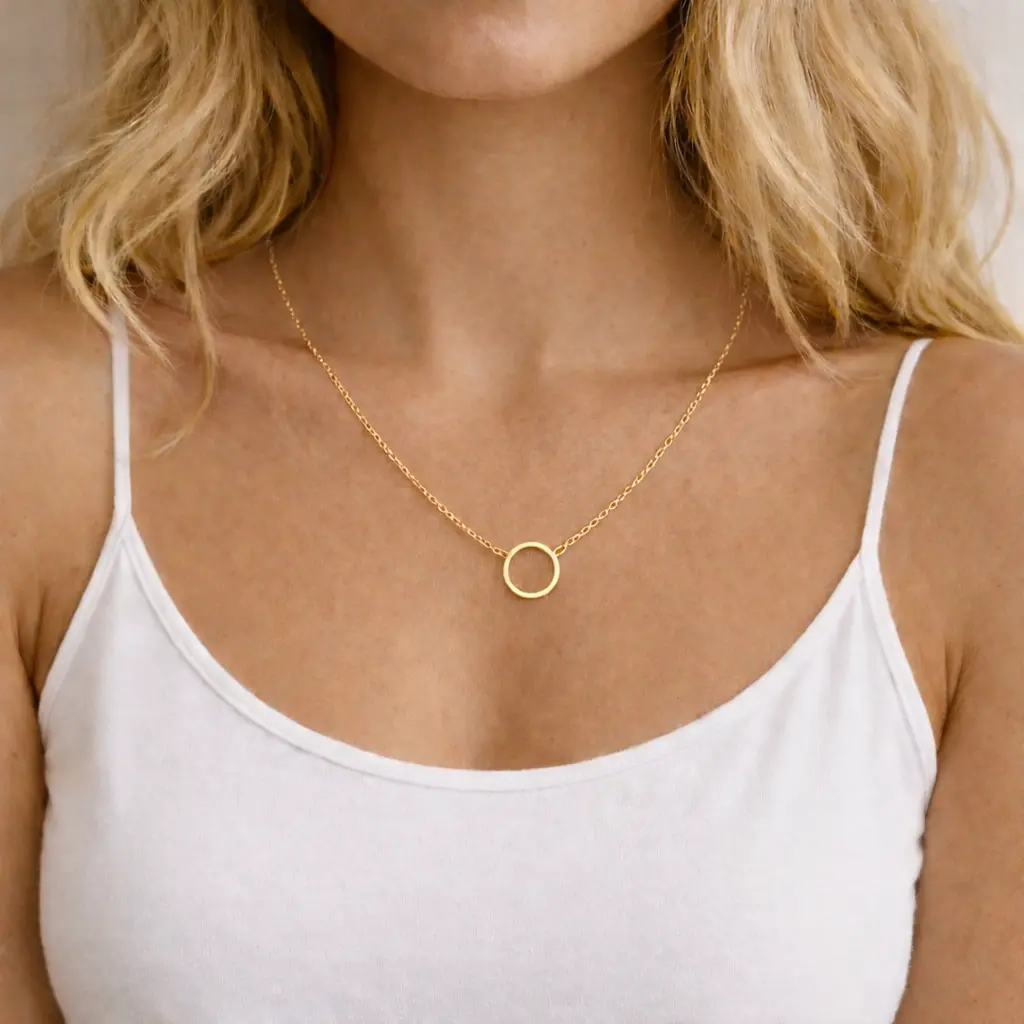 Este collar círculo dorado es una joya minimalista pensada para mujeres que valoran la sencillez bien diseñada. El colgante circular, limpio y proporcionado, aporta un punto de luz discreto que realza el escote sin sobrecargar el look. Es un collar que no sigue tendencias pasajeras: funciona siempre.