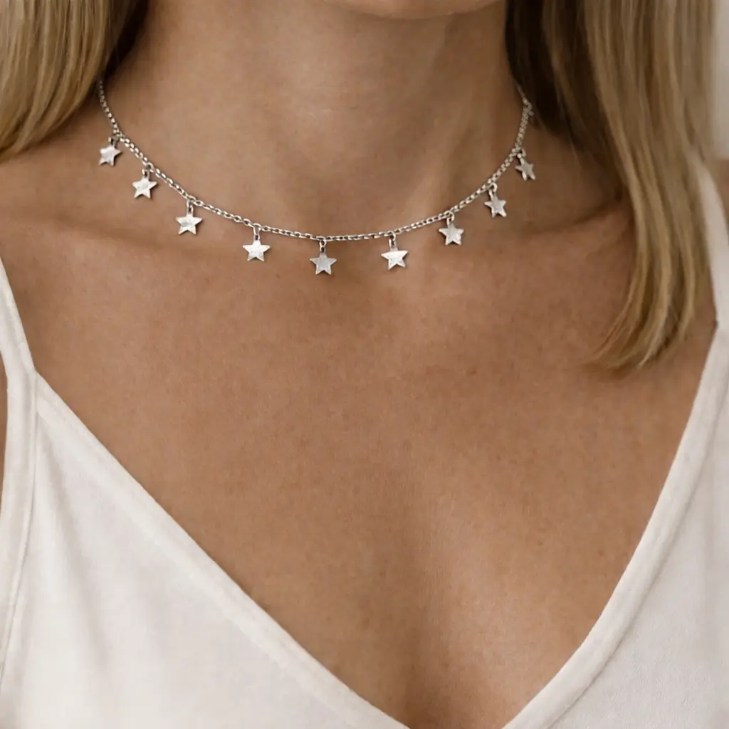 Este collar con estrellas destaca por su diseño delicado y discreto, formado por pequeñas estrellas colgantes distribuidas de manera armoniosa a lo largo de la cadena. Su estilo minimalista lo convierte en una pieza versátil que aporta un toque luminoso y femenino al escote, ideal para el uso diario o para completar looks más especiales.