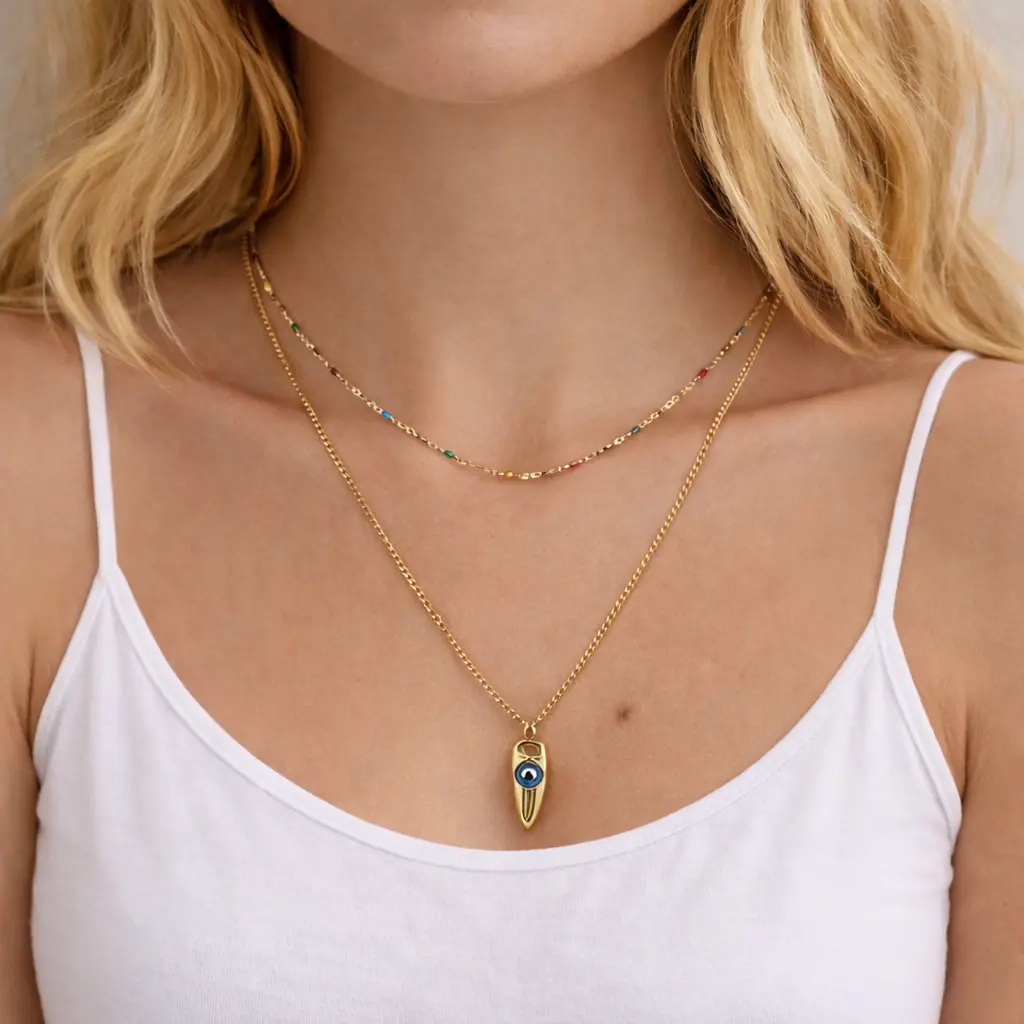 Collar cuerno para mujer compuesto por dos cadenas finita dorada y adorno cuerno con ojo turco . El collar a capas con cuerno tendencia a llevar con todos tus looks. Este collar en acero inoxidable de calidad es perfecto para llevar a diario ya que es resistente al agua.