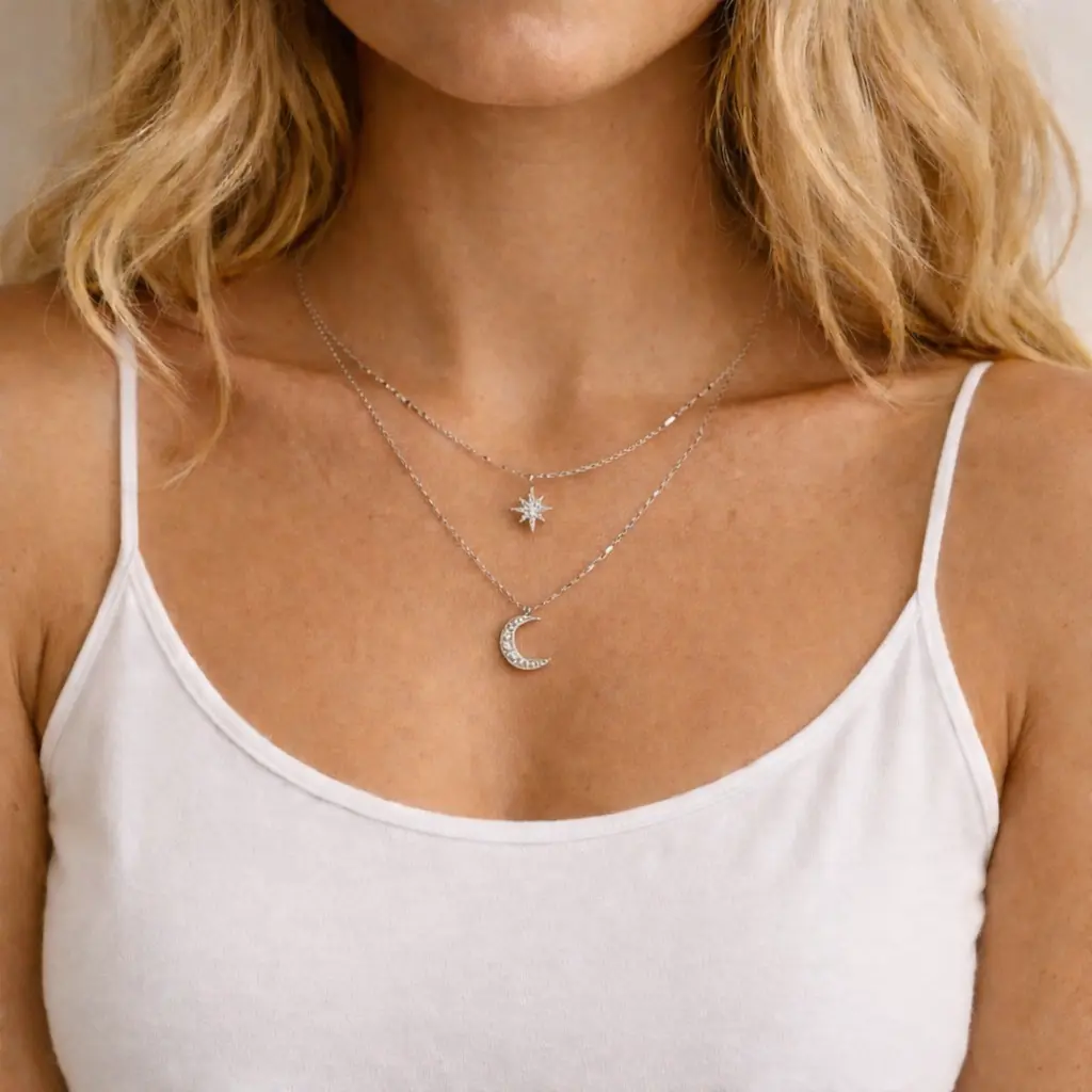 Este collar con una luna en plata 915 es una joya delicada y luminosa, pensada para mujeres que buscan un collar con simbolismo y un diseño refinado. La luna creciente, acompañada de una pequeña estrella, crea una composición equilibrada que transmite calma, intuición y conexión emocional.