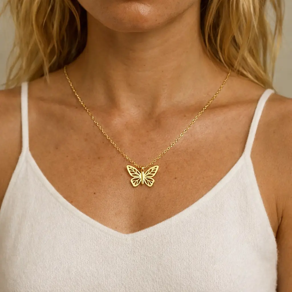 Collar mariposa en acero inoxidable, un diseño elegante y delicado que aporta un toque femenino a cualquier look. La mariposa tiene un acabado calado que imita las alas abiertas con gran detalle, dándole un estilo ligero y sofisticado. Está fabricado en acero inoxidable dorado, resistente al agua, hipoalergénico y que mantiene su brillo con el uso diario. La cadena es fina y ajustable, lo que permite adaptarlo a diferentes largos. Ideal para regalar o llevar a diario, este collar mariposa es el complemento perfecto para darle un aire fresco y elegante a tu estilo.