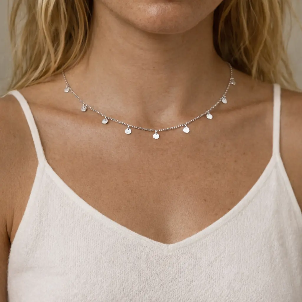 Gargantilla medalla en acero inoxidable. Este collar con cadena fina corto con pequeñas medallas est una joya fina estilo minimalista perfecta para llevar sola o con otros collares de la colección. Un collar de calidad resistente al agua perfecto para llevar en tu día a día.