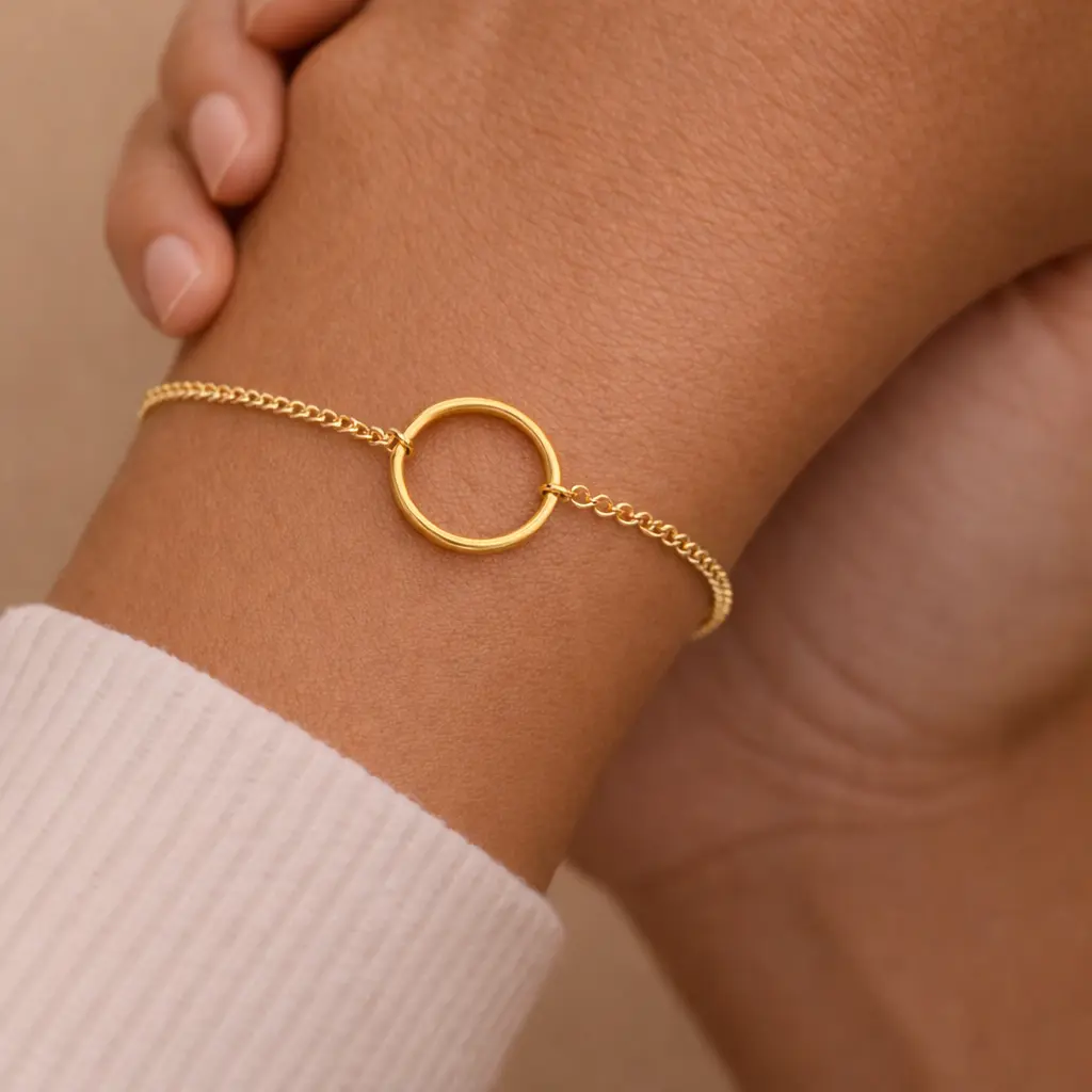 Pulsera circulo, simboliza el circulo del Karma, su significado es muy profundo y se conoce como “se cosecha lo que se siembra”. La pulsera con circulo perfecta para regalar en cualquier ocasión. Fabricada en metal de alta calidad con acabado dorado o plateado, esta pulsera destaca por su ligereza, comodidad y estilo atemporal. Ideal para llevar a diario o combinar con otras pulseras finas.