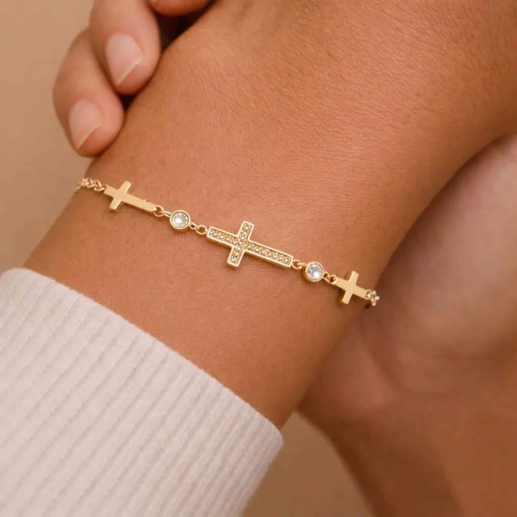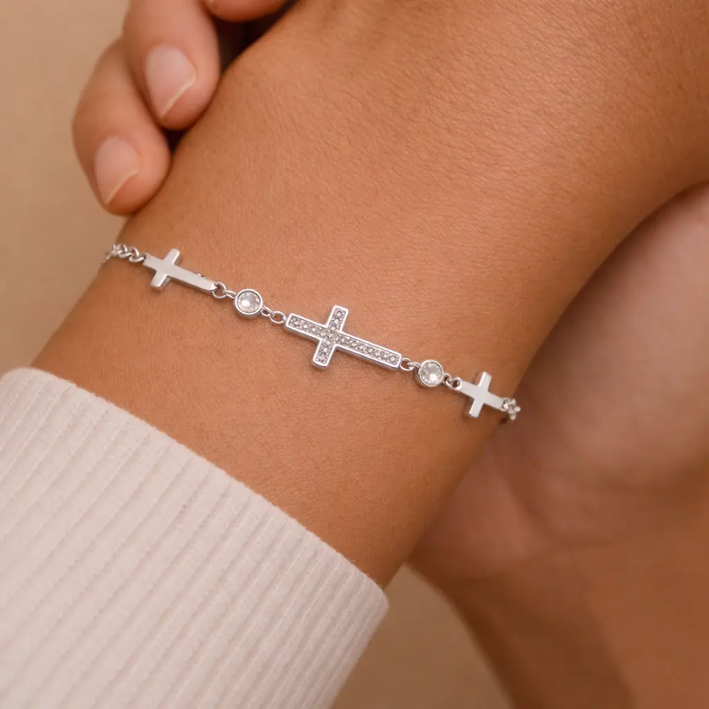 Esta pulsera cruz para mujer es una joya elegante y atemporal que combina simbolismo y sofisticación. Su diseño incorpora una cruz central decorada con circonitas blancas, acompañada de pequeños detalles laterales que aportan brillo y delicadeza.