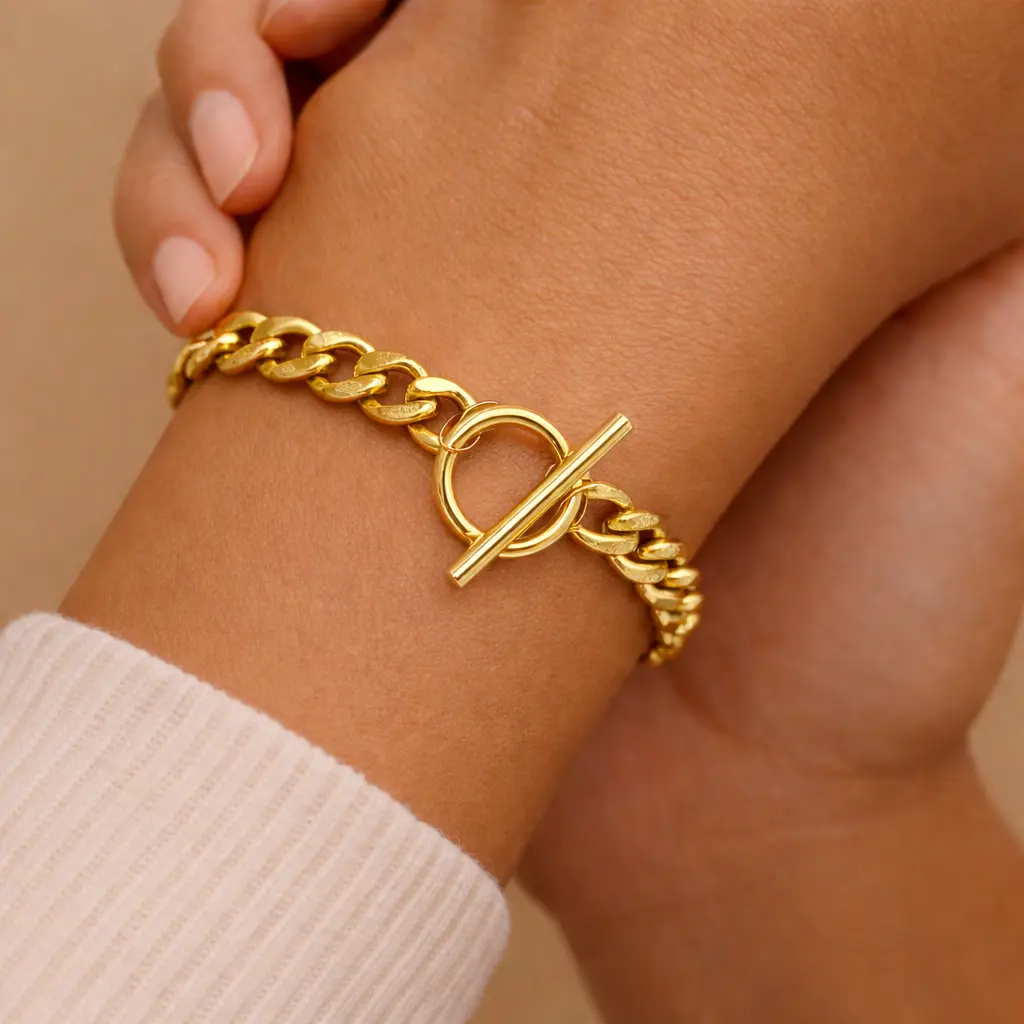 La pulsera de eslabones tendencia para mujer es una joya protagonista, moderna y elegante, imprescindible en las colecciones actuales de joyería. Su diseño de cadena gruesa con cierre tipo T aporta un estilo sofisticado y contemporáneo, ideal para elevar cualquier look.