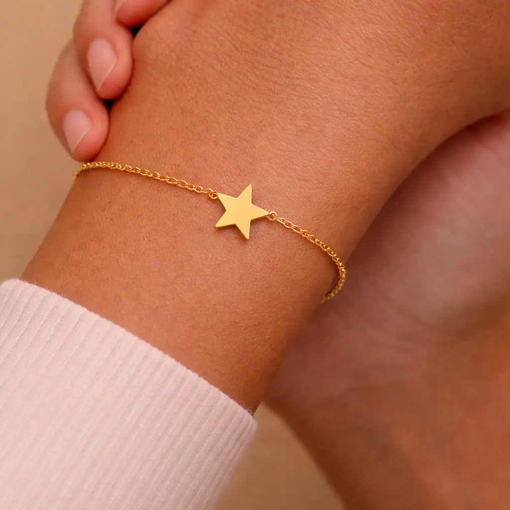 Pulsera estrella en acero inoxidable para mujer. Una joya delicada y elegante que simboliza luz, ilusión y buena energía. Su diseño minimalista con estrella central la convierte en un complemento perfecto para el día a día, aportando un toque femenino, moderno y atemporal a cualquier look.