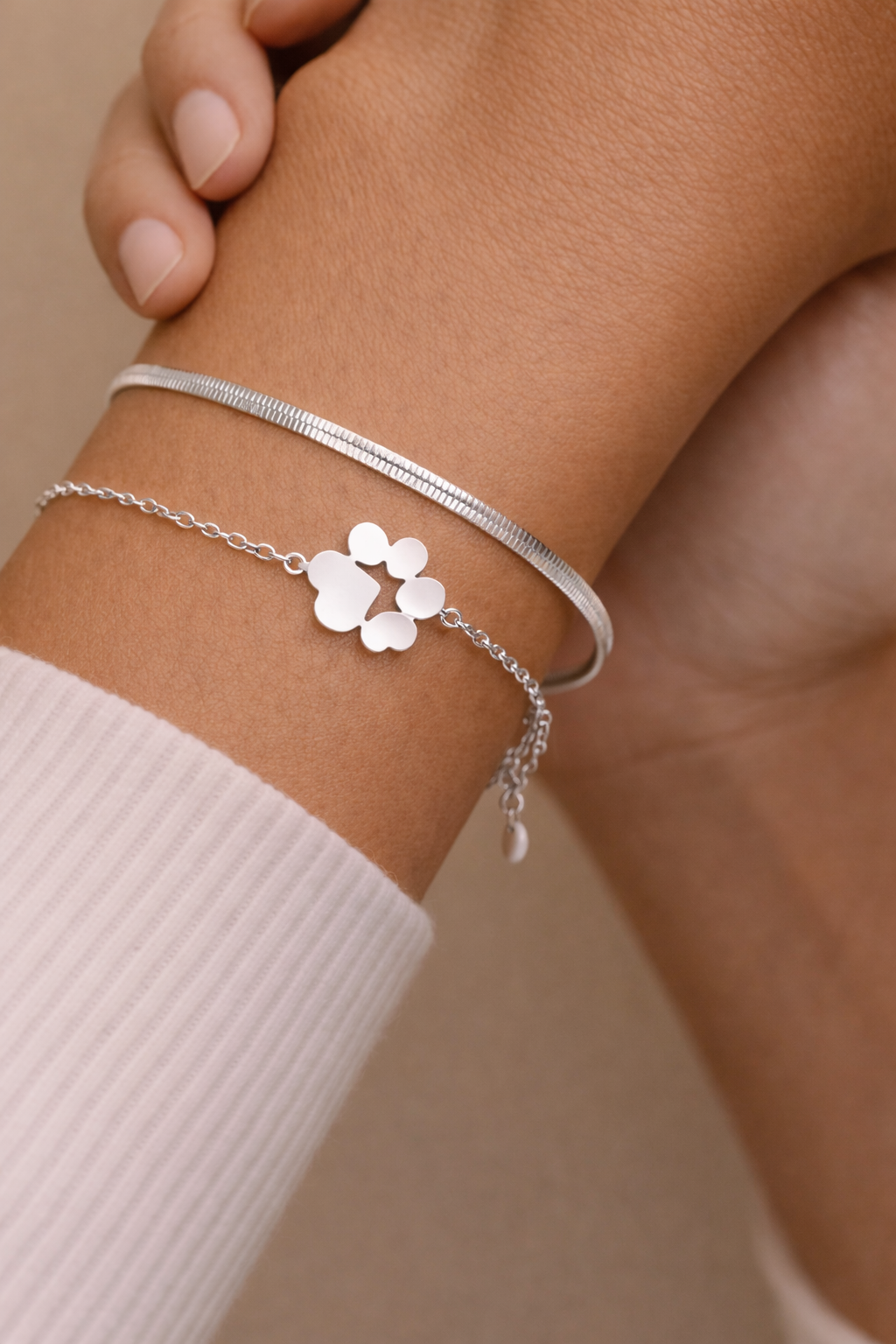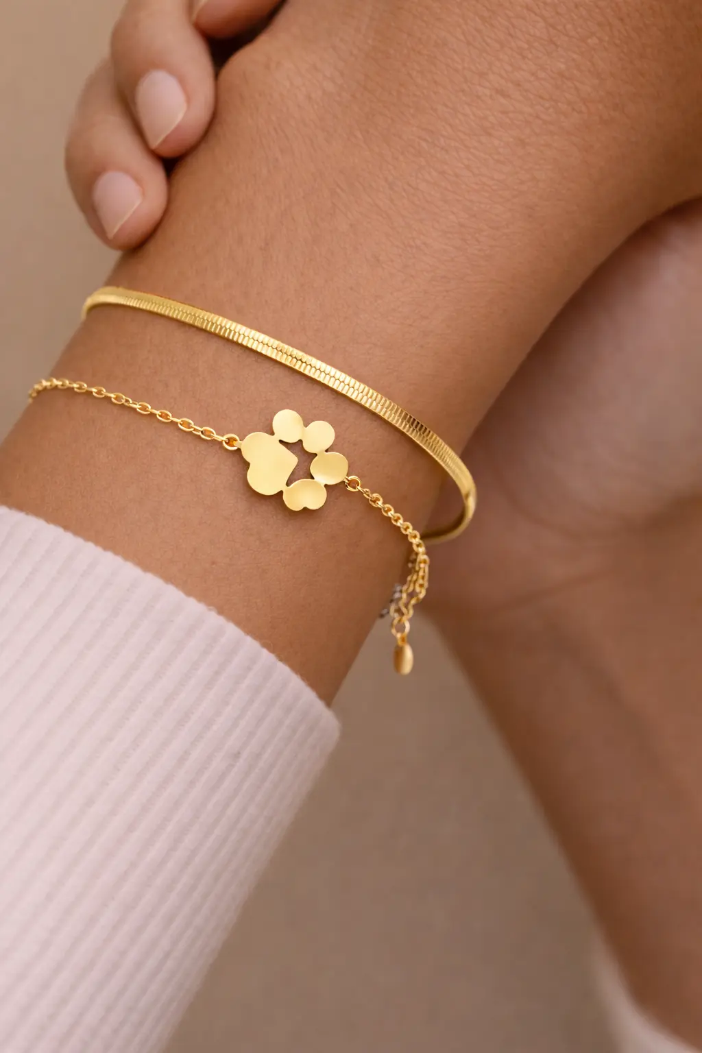 Pulsera huella de perro, un diseño moderno y original,  en acero inoxidable de alta calidad, resistente al agua y al desgaste, ideal para el uso diario. La pulsera cuenta con una delicada huella de pata de perro en el centro, acompañada de dos finas cadenas que se ajustan cómodamente a tu muñeca. Disponible en dorado y plateado, es el regalo perfecto para mujeres que adoran a los perros y quieren llevar siempre un detalle especial que les recuerde a su mejor amigo.