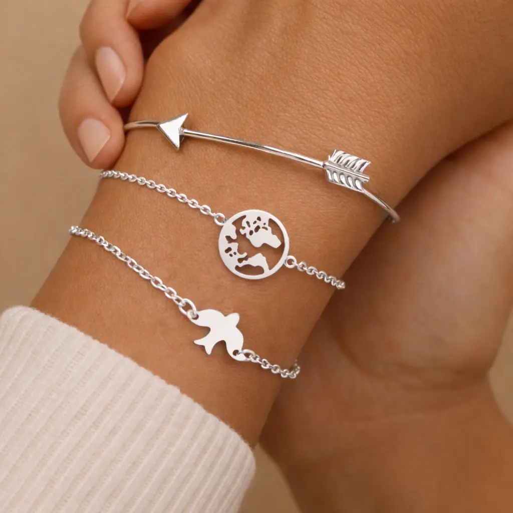 Conjunto de 3 pulseras plateadas, con adornos mundos, pajarito y pulsera flecha. Puedes llevarlas solas o con otras pulseras de la colección.